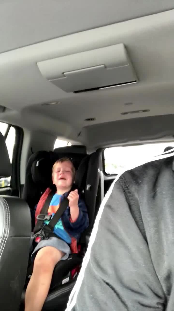 A tot boy throws a tantrum in the back seat of a car then takes his shoe off and throws it at the camera.