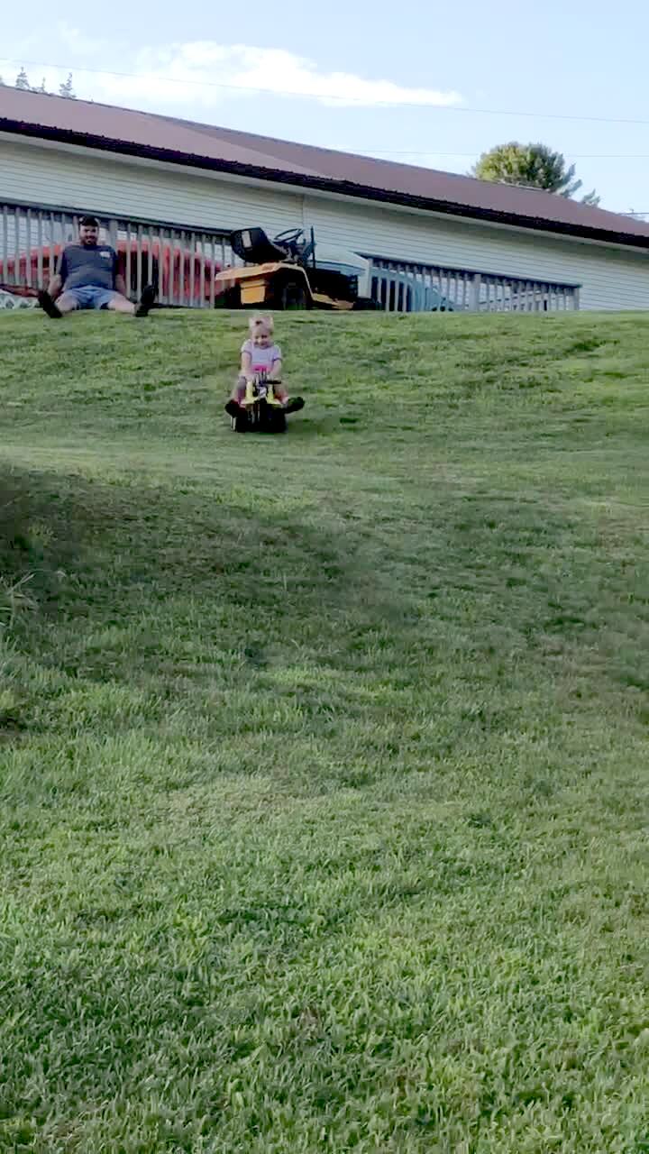 A man kicks a ball to a cat which grabs it and accidentally tackles a baby boy who is sitting on the floor while trying to retrieve it. Security footage.