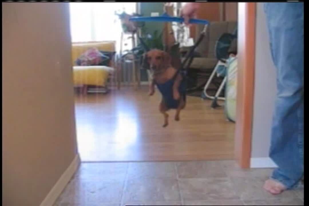 Dachshund dog sits in a baby's jolly jumper chair. Funny visual.