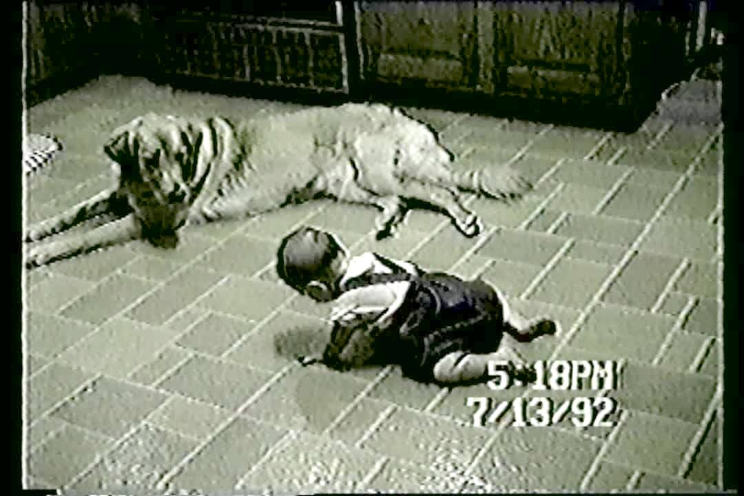 Baby boy lays on the floor next to a dog, dog licks baby's entire face. Baby's mouth is open & dog's tongue goes into his mouth. Gross.