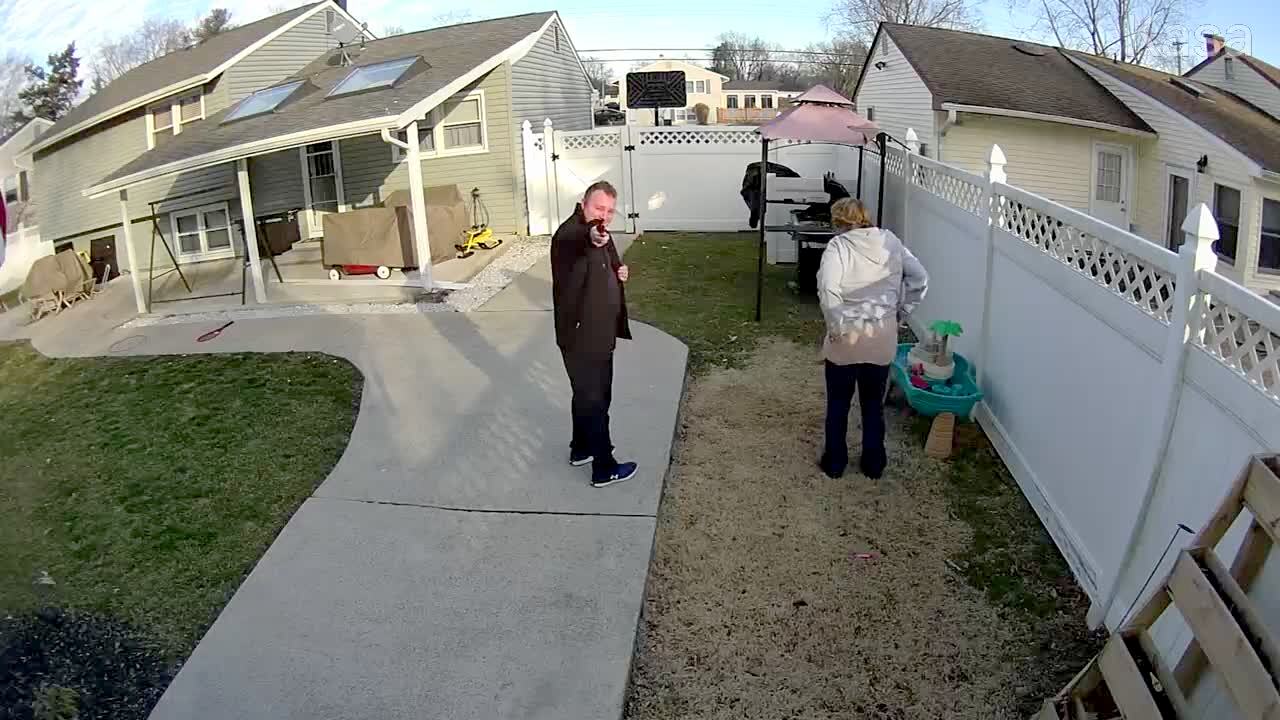 A security camera captures a man walk backwards with a wheelbarrow and fall into a pool in a backyard.