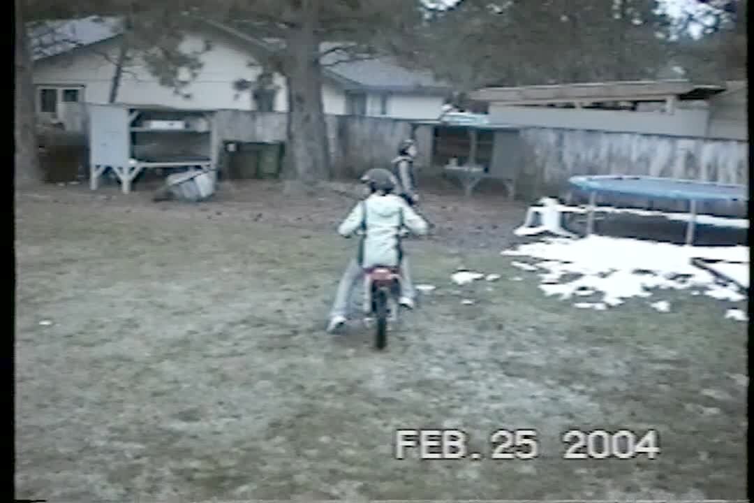 Young girl rides a dirt bike into a fence and breaks a panel section of it.