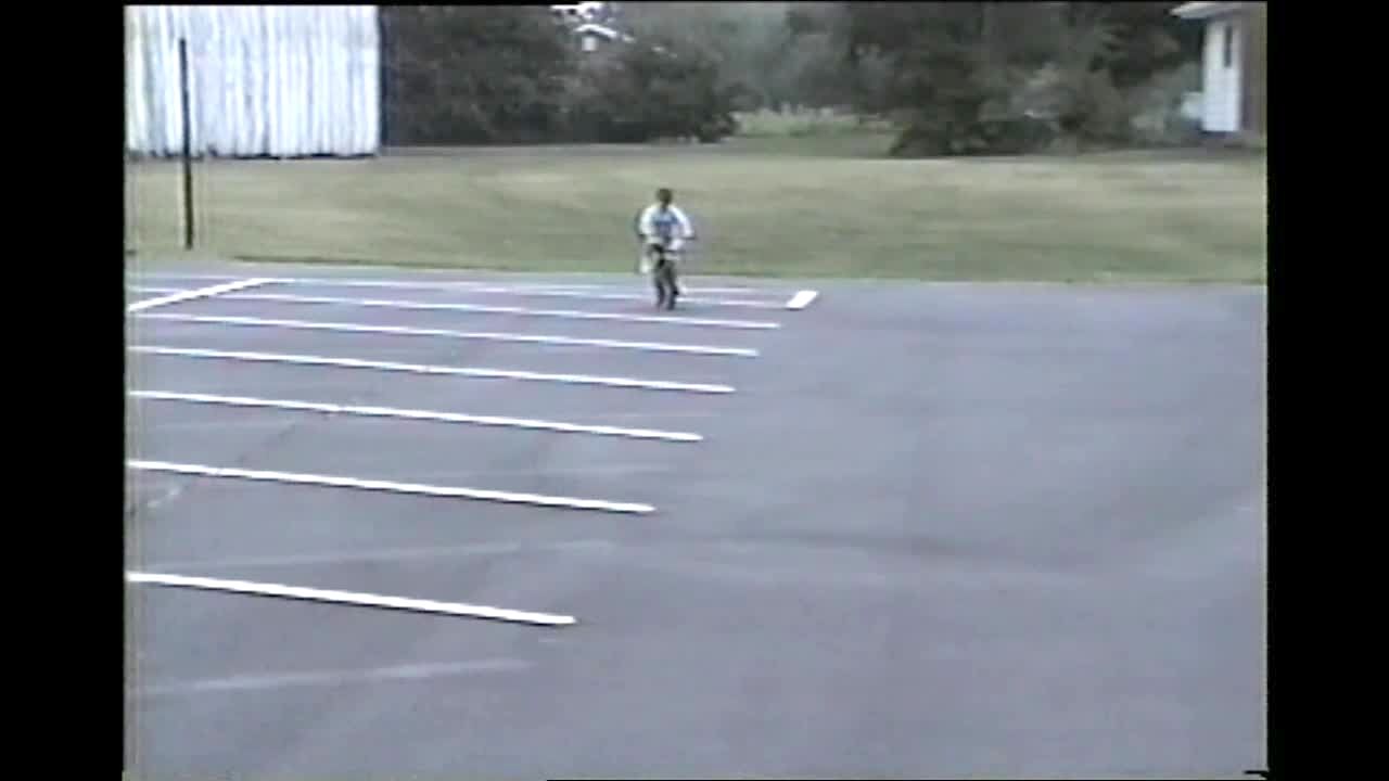 A teen boy attempts to do a wheelie trick on a motorcycle in the driveway of a home, but he loses control and falls through a fence. Security footage.