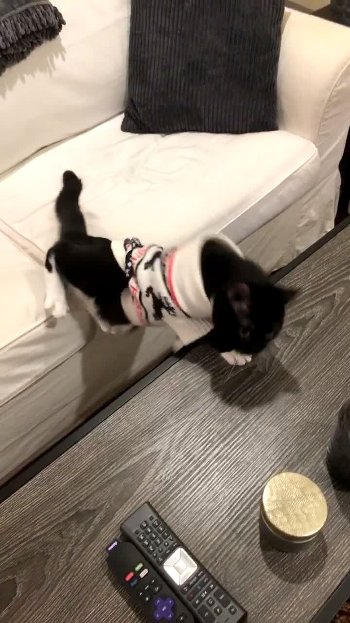 A cat wears a Christmas sweater. He struggles to walk and falls off of a couch between the couch and a coffee table.
