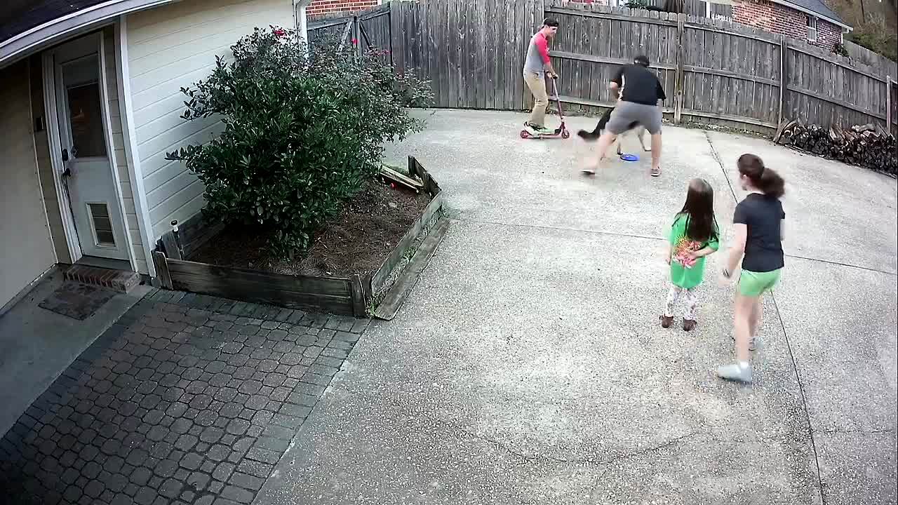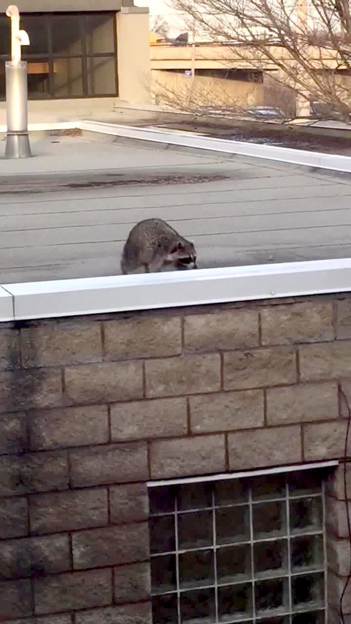 A raccoon walks around a yard of a house and then climbs up to an open window, and a family that watches him freaks out as a man off screen races to scare him off.