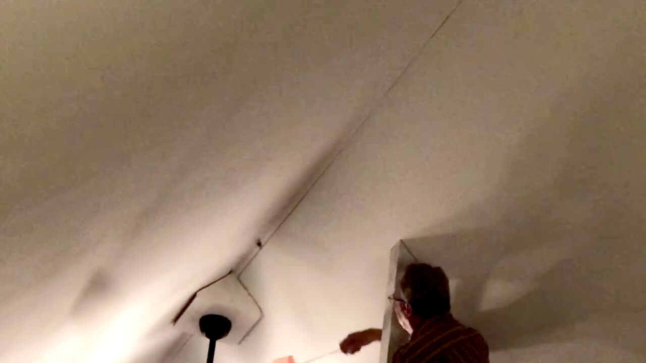 A man stands on a ladder and uses a chainsaw to saw off part of a porch roof/awning. The wood beam the man cuts hits his ladder, he falls, flips and rolls off the porch with his legs bent over the back of his head. Security camera.