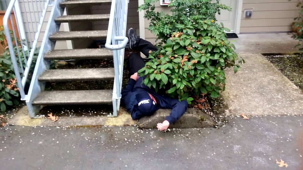 A man climbs on the side of a building outdoors, falls down into a bush, and laughs.