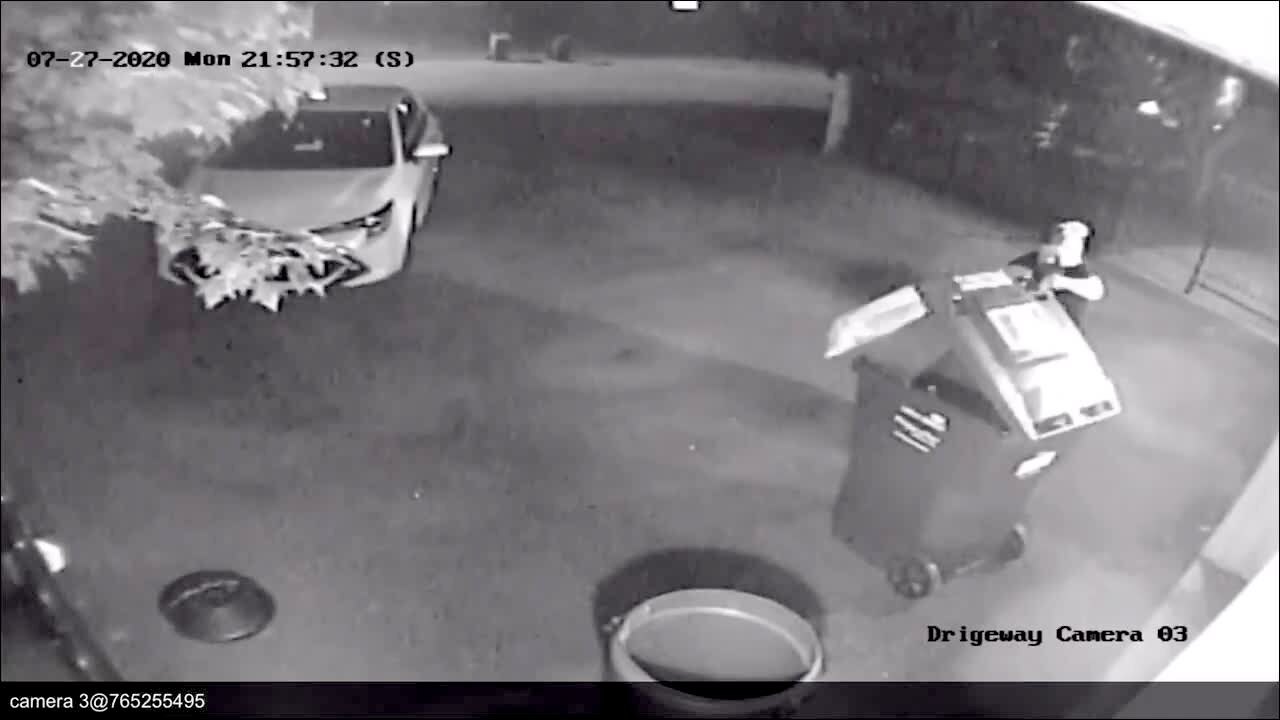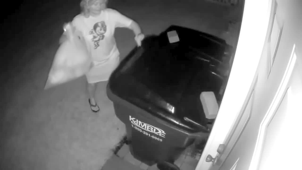 A woman puts a trash bag in a trash can in a driveway at night and a raccoon jumps out and she screams and they both run away. Security camera.