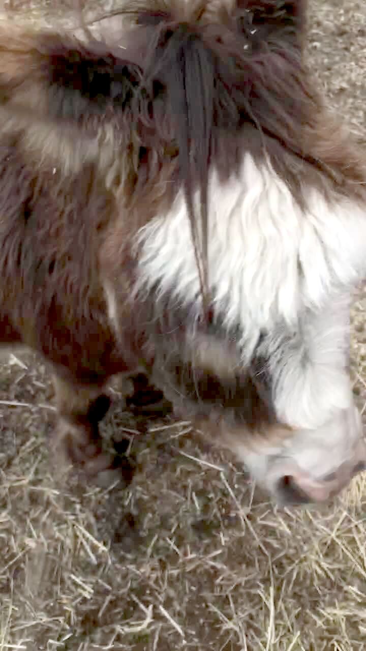 A senior man gets stuck in a barn when a donkey locks the door and he laughs and a woman unlocks the door in a yard.