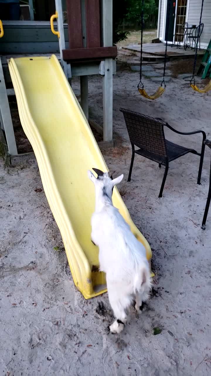 A goat tries to run up a slide and repeatedly slips down until he climbs up into a play house in the yard.