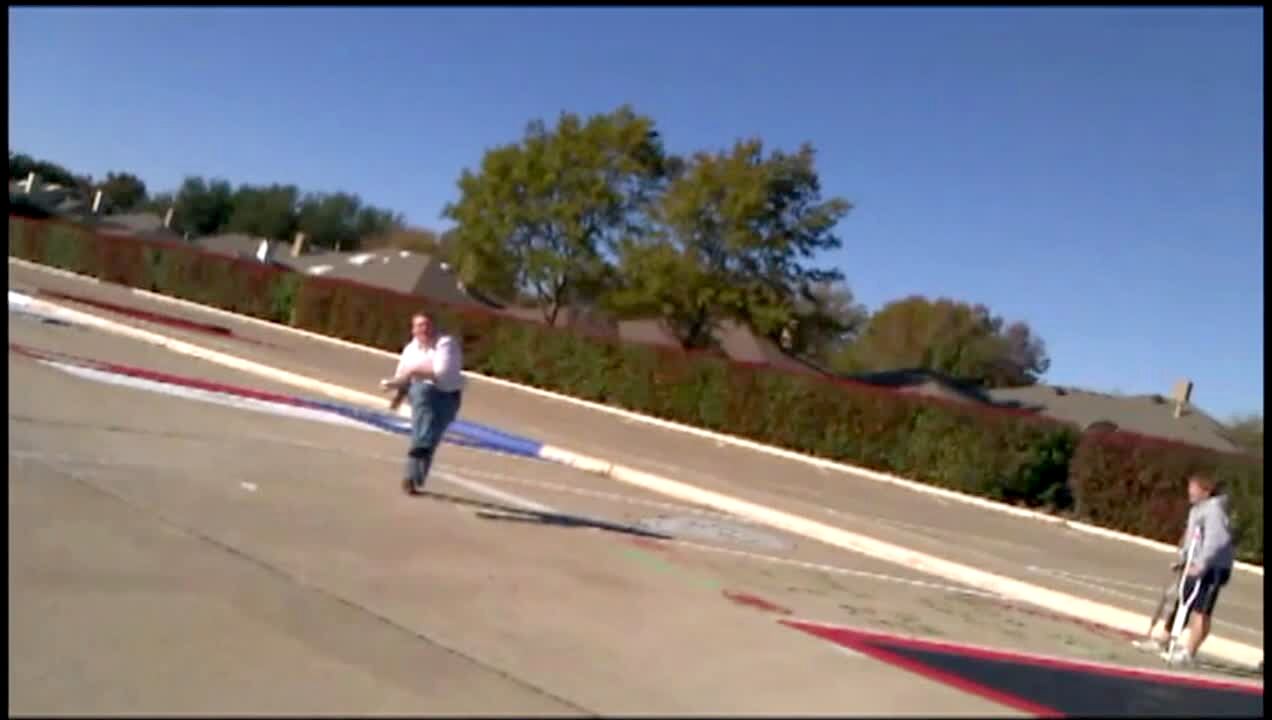 Man throws model airplane, it comes back around & hits another man hard in the head, knocks him down. Glider. Park.