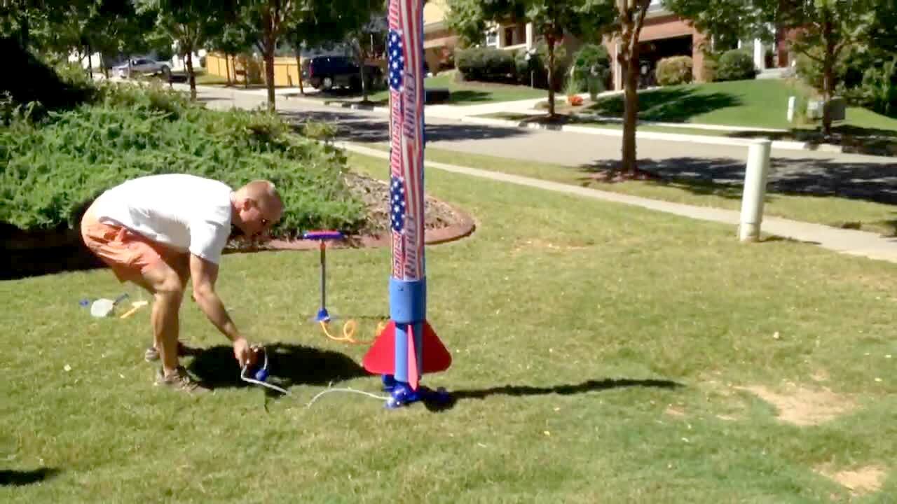 A man pumps water into a rocket outdoors and after a woman says that they'll get soaked with water when it launches, the man triggers the rocket and it barely bounces off the ground before falling over.