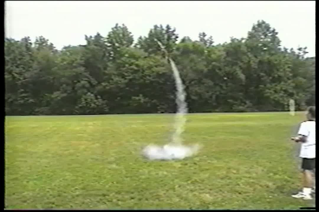 Model rocket zooms right by guy when it launches. SET-UP FAKE