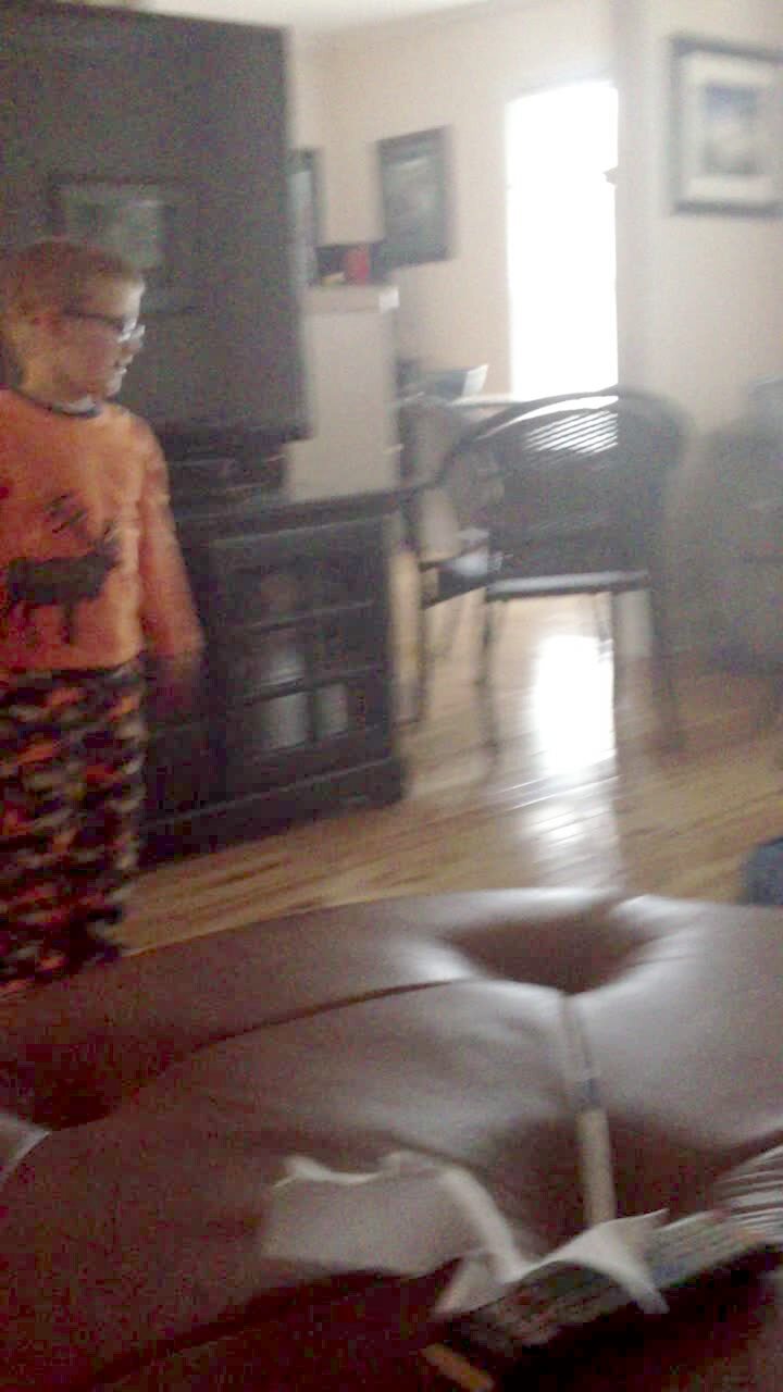 A young boy in his house wraps his younger brother with tape. A woman asks the older boy why he did it and he responds that his brother wanted to look like a mummy.