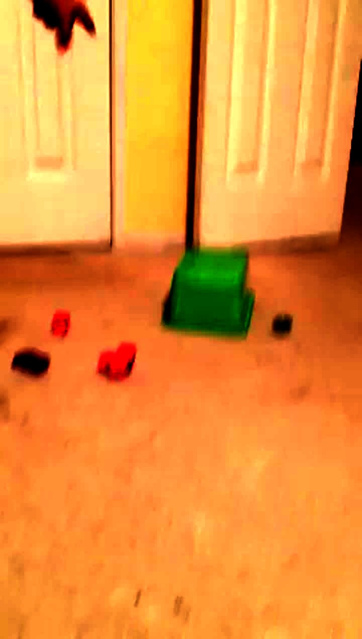 A baby boy laughs in the bedroom when his older brother pretends to trip on a toy. The boy asks his mom if this is how brother's play and then pushes the toy across the floor and it hits the baby and knocks him over.