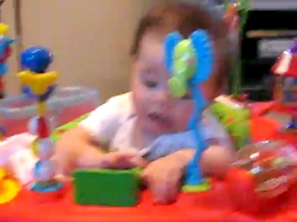 Baby boy playing in walker farts loudly, looks at the camera and smiles
