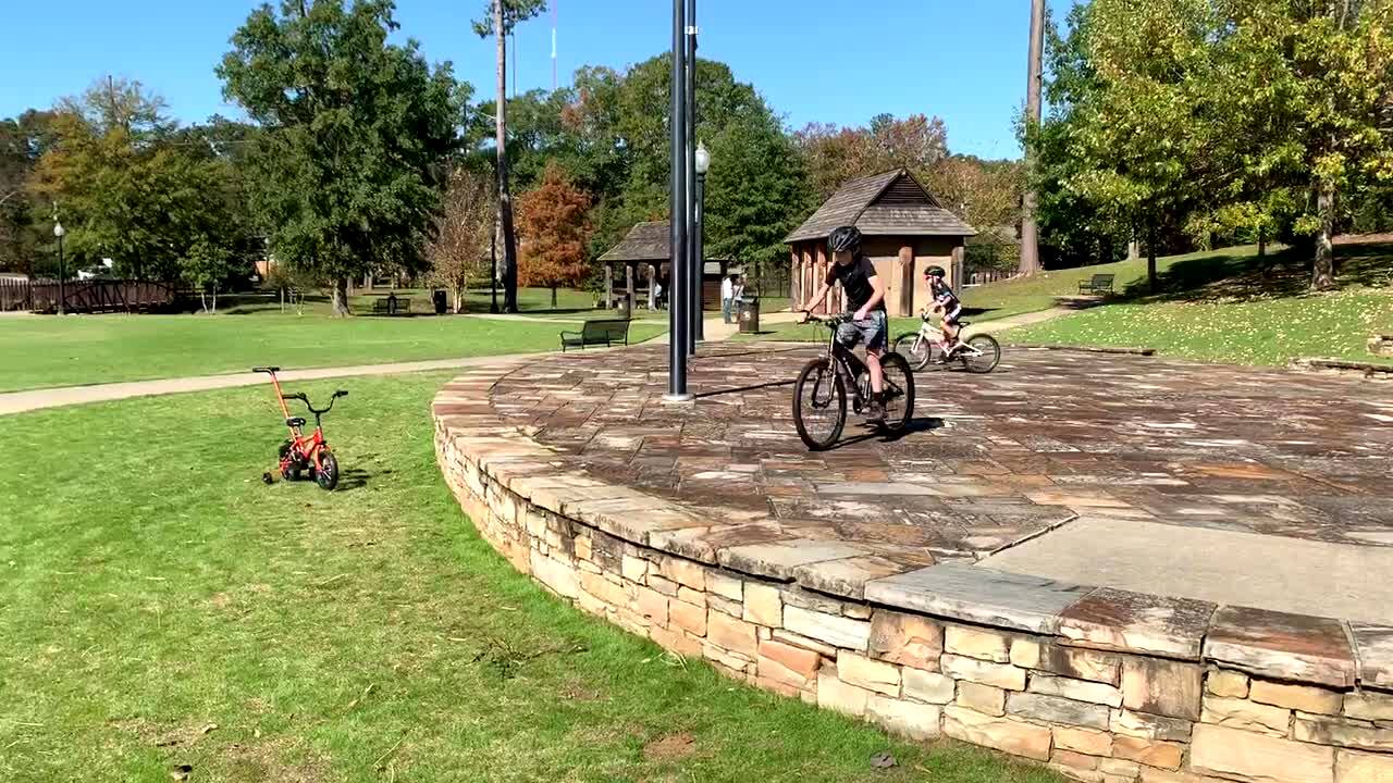 Little girl rides bike around in circles, bragging about not needing training wheels. Then she crashes into little brother, hitting his head. She falls over.