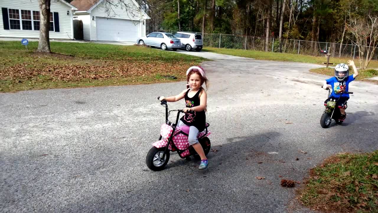 A boy riding a dirt bike in the street collides with a tot girl riding a go cart and crashes.