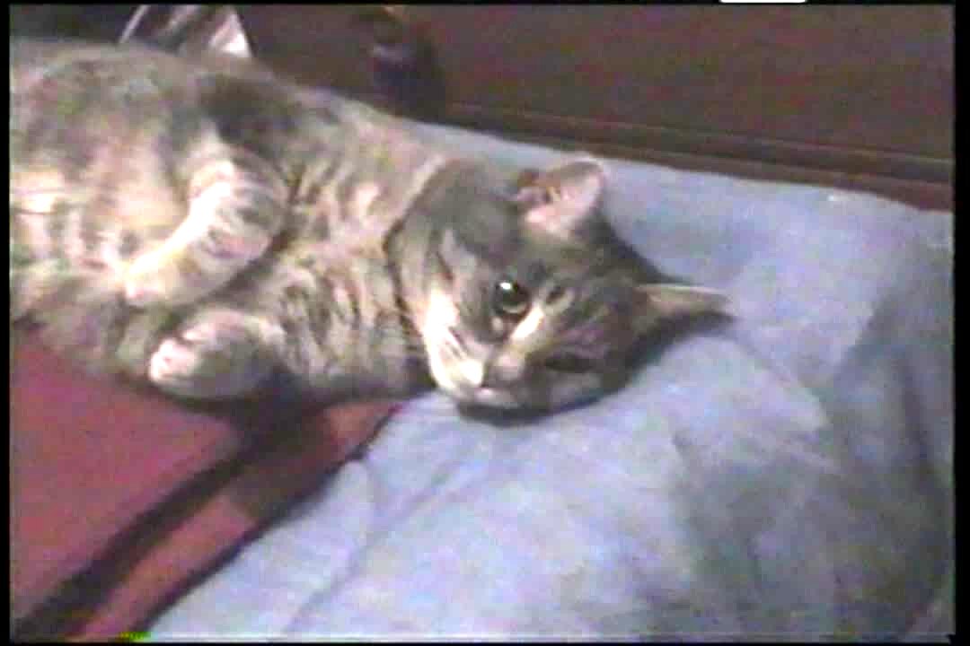Gray cat is shot up close and his eyes move around when his arms are spread open wide. Macarena plays over clip. Weird.