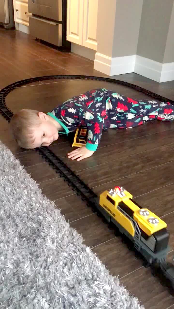 A tot boy lays on a toy train track and a toy train hits him in the face.