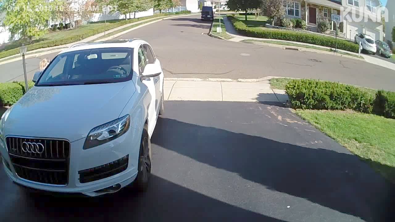 A tot girl tries to catch a remote control car in a backyard but it drives away repeatedly and she gets frustrated. She puts her baby doll toy on top of the car and it drives away and her family laughs.