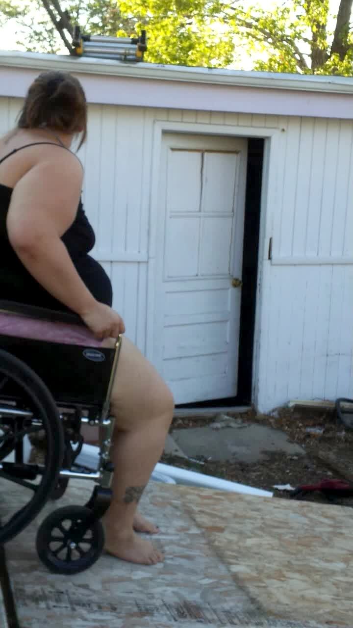 An adult woman sits in a chair and, suddenly the back gives out and she falls backwards outdoors.