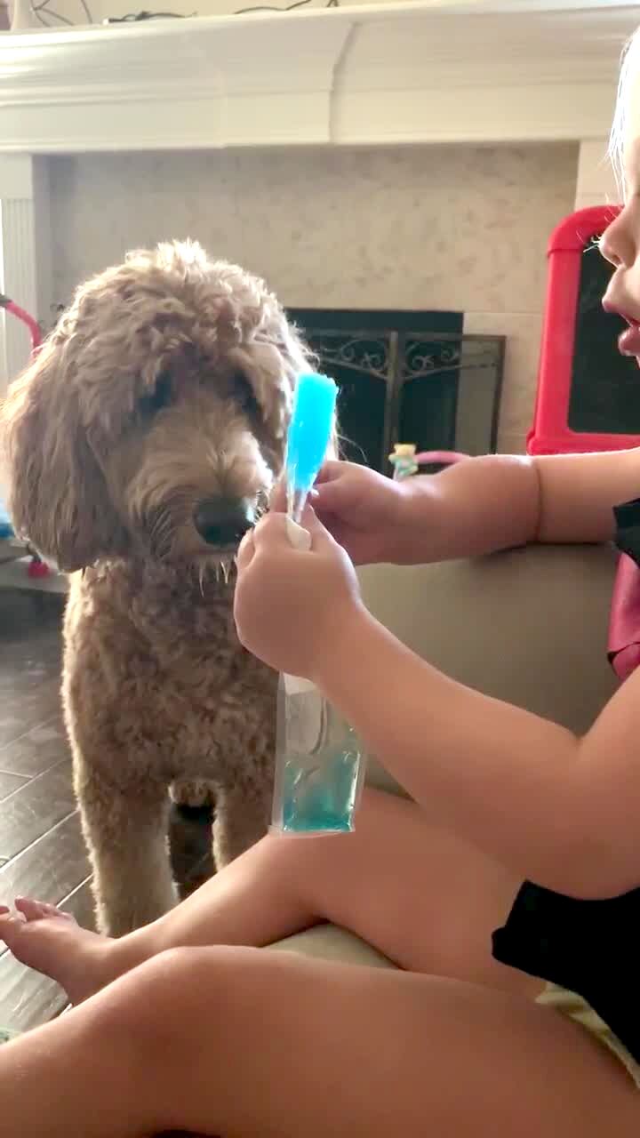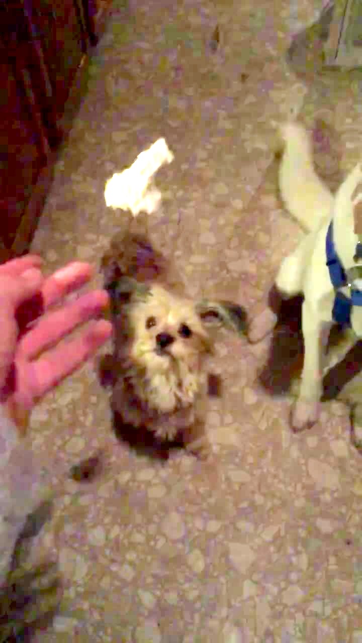 A treat bounces off a dog's mouth in slow motion, it looks around for it on the floor, then another dog takes it and runs out of the room.