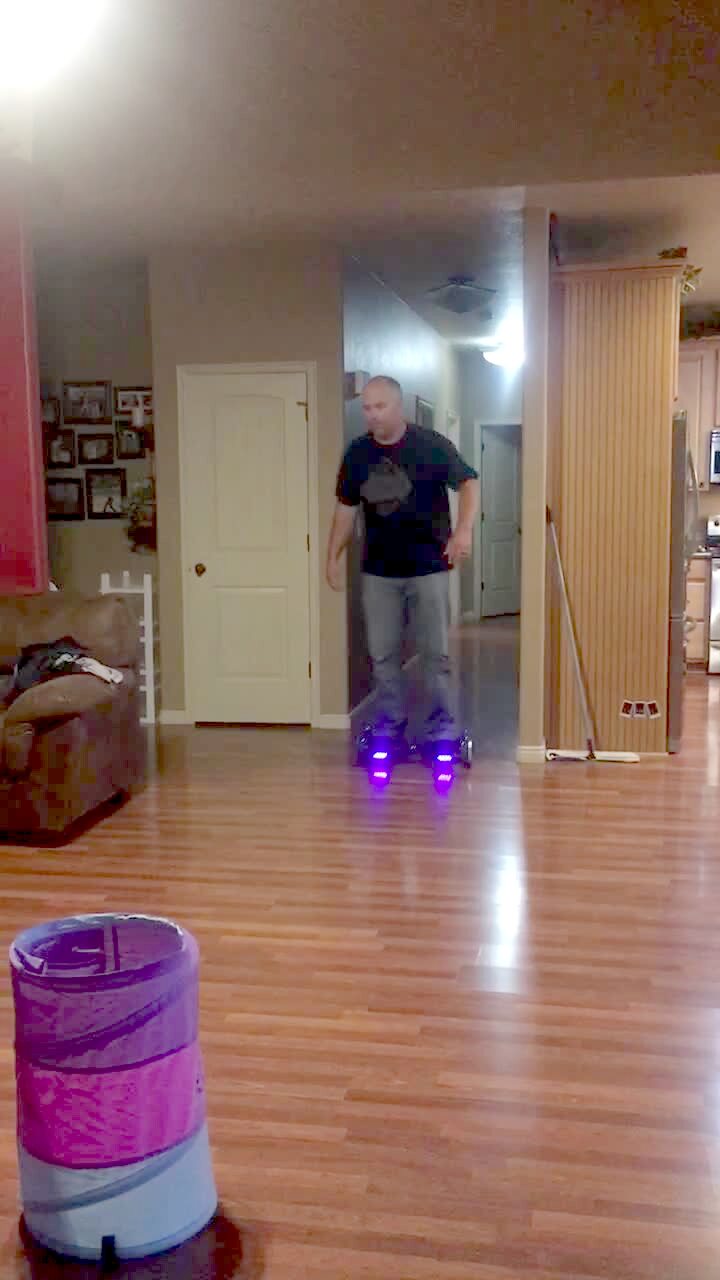 A man plays a virtual reality game in a living room and runs and crashes into a table and falls over. Security camera.