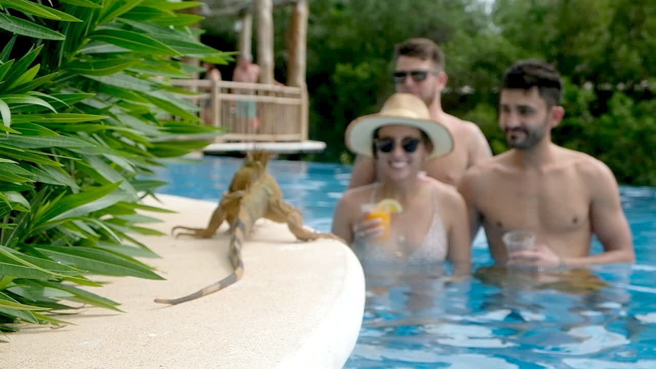 Three men swing on play set then it breaks and they fall to grass. Featured talent cleared only (the four men).