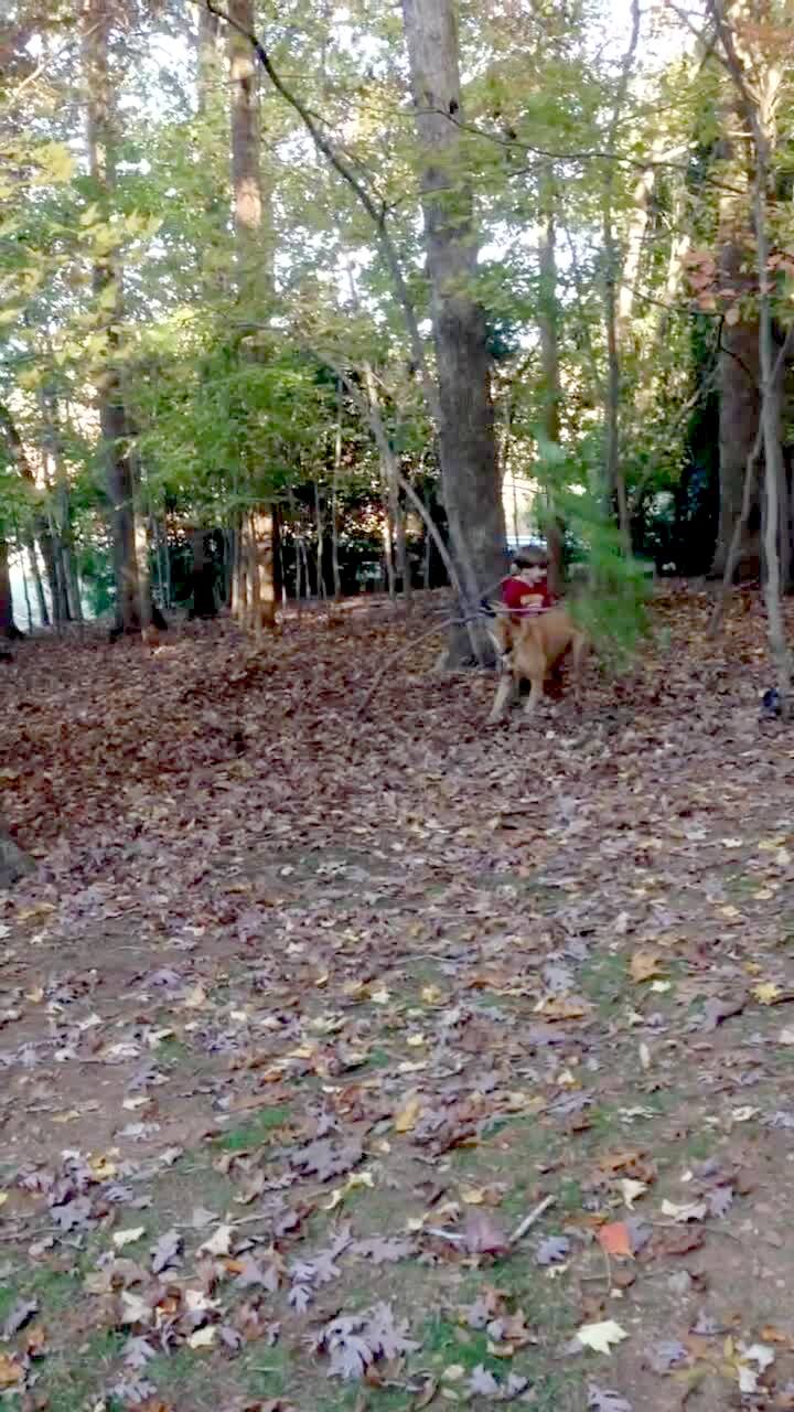A dog pulls a tree branch back in the woods and snaps it into a tot boy's face. The dog then pushes the tot over.