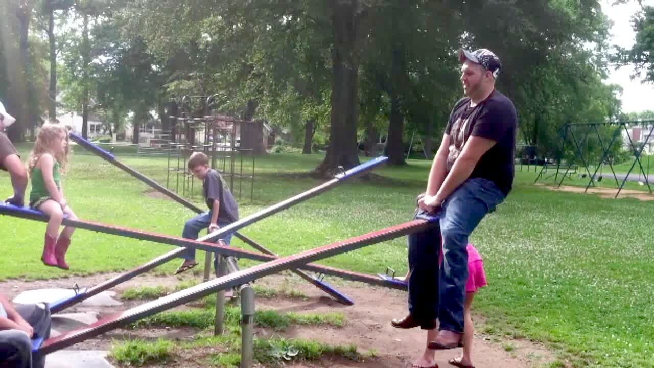 Man and brother ride teeter-totter at playground, one on left falls hard and hits head. . Senior