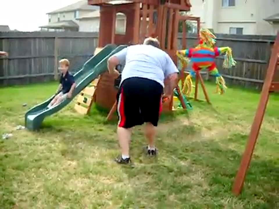 A man spins around on a bat in a back yard. He stumbles and falls, dizzy as he prepares to hit the pinata hanging from a swing set with a bat. He falls again as he hits it. Several kids and adults laugh at him. A man and a boy hit him with bats as he lies on the ground.