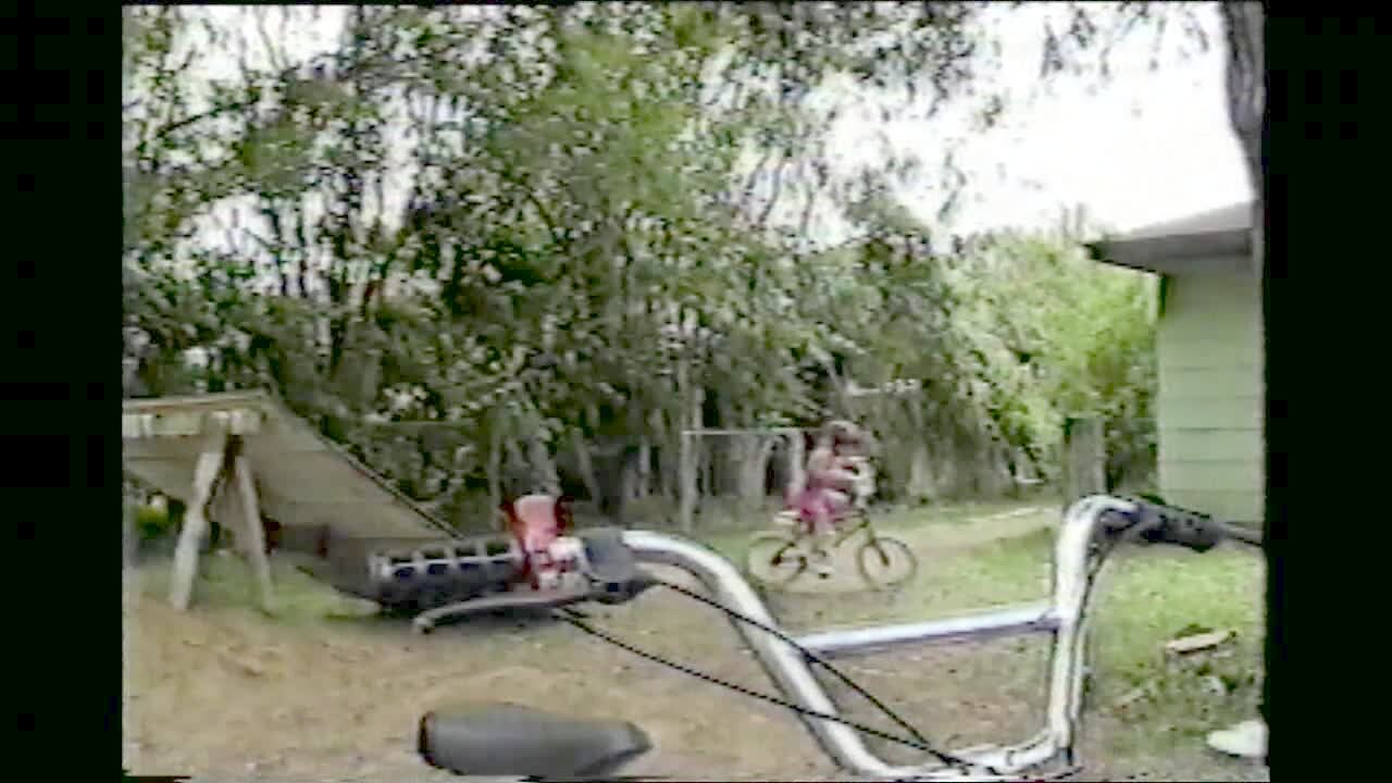Two young men run and jump on a slip 'n' slide in the yard outdoors and one of them stands up right at the end and continues to run but he loses control and falls into a fence and breaks it. Missing appearance releases for people in the background at the beginning of the video.