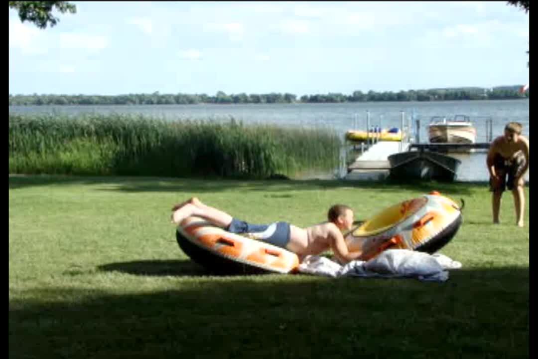Teen boy in bathing suit near a lake runs and jumps on two inner tubes on the grass and falls down. Same clip on 4V-06.