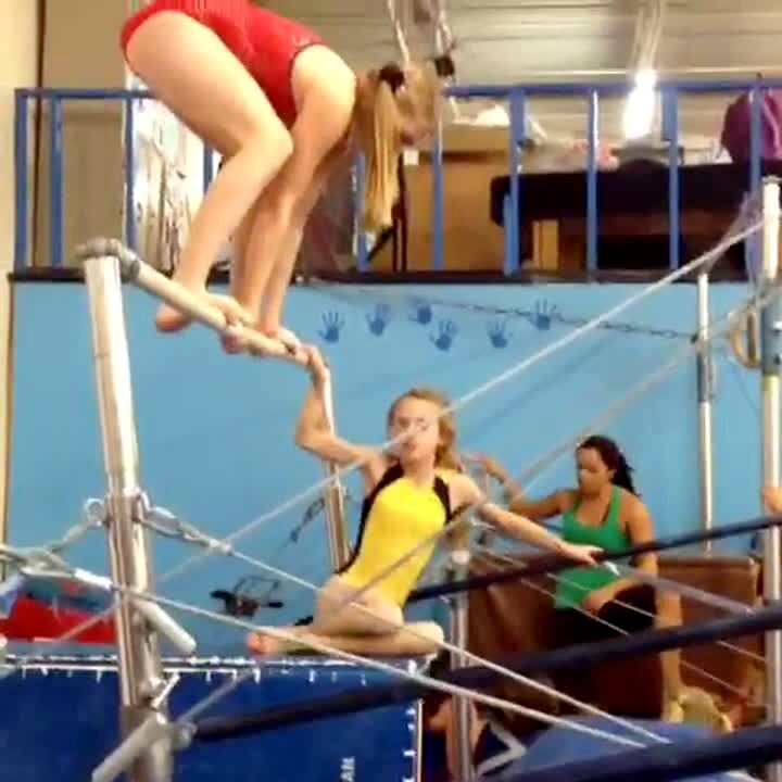A teen girl in a leotard spins around the uneven bars in a gymnastics gym but loses her grip when she collides with a large pad and falls.