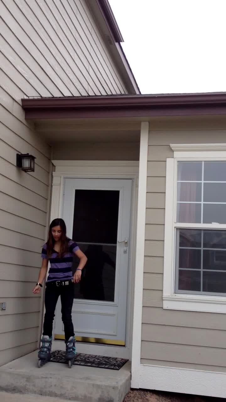 A teen girl wears roller blades and tries to jump down her front steps outdoors but slips and falls.