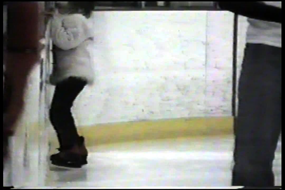 An 8 year old girl is skating on a home ice rink when at 0:32, she swings her stick and hits dad in the head and he drops camera.