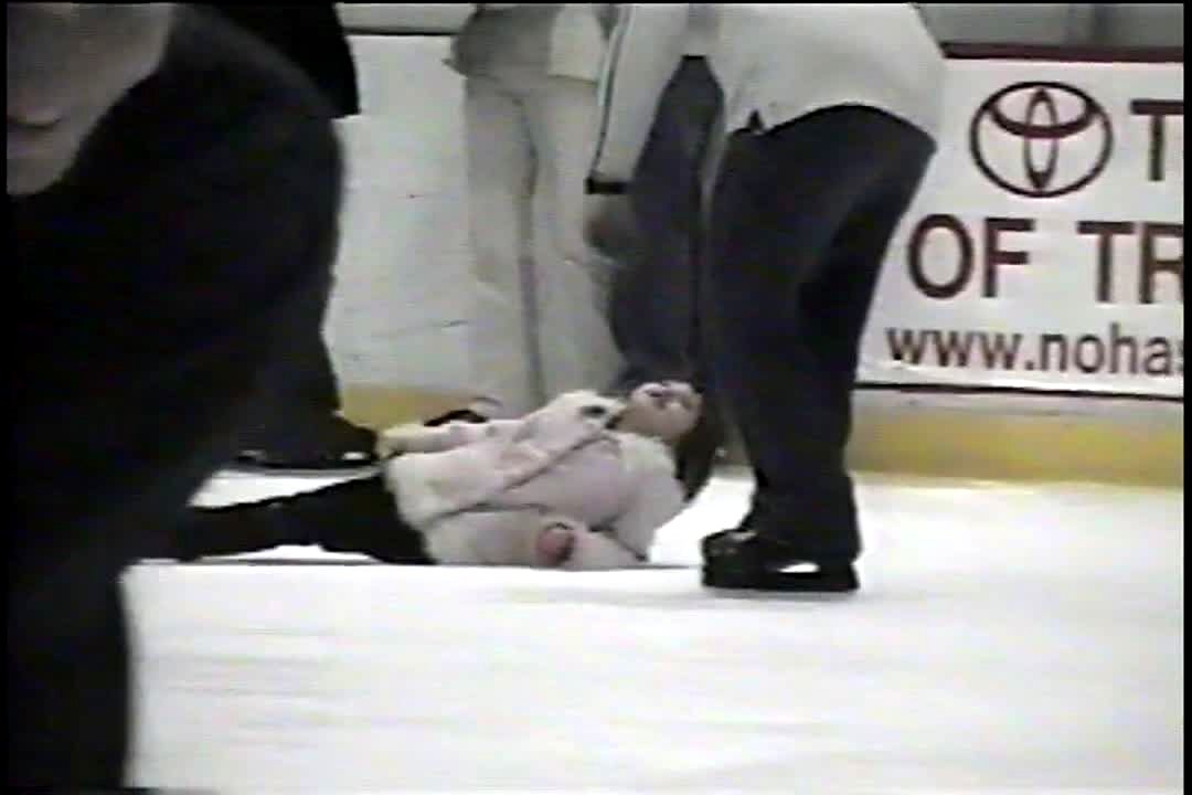 A teen girl roller skates down a store aisle. She then runs into a stand, falls down and the stand falls on top of her. Short tail