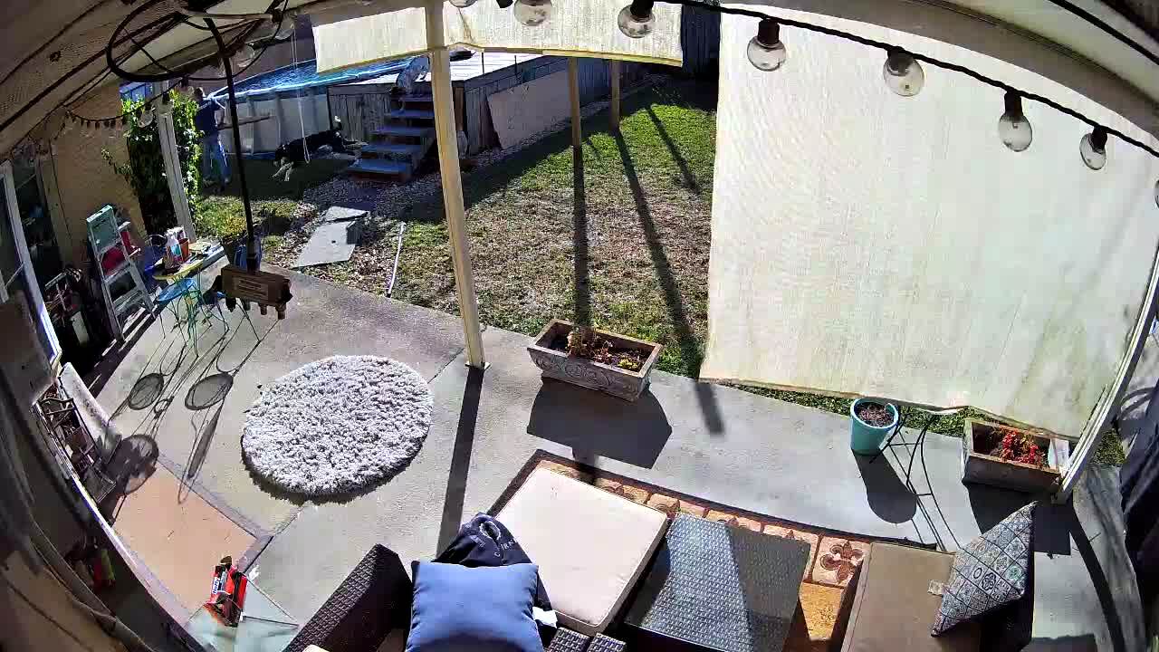 Two dogs run and play in a yard and run into man and knock him down on the ground. Home security footage.
