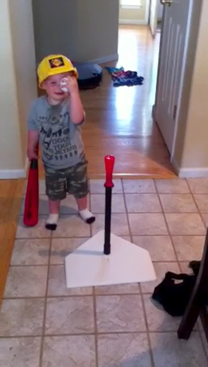 Little boy hits plastic baseball into cameraman