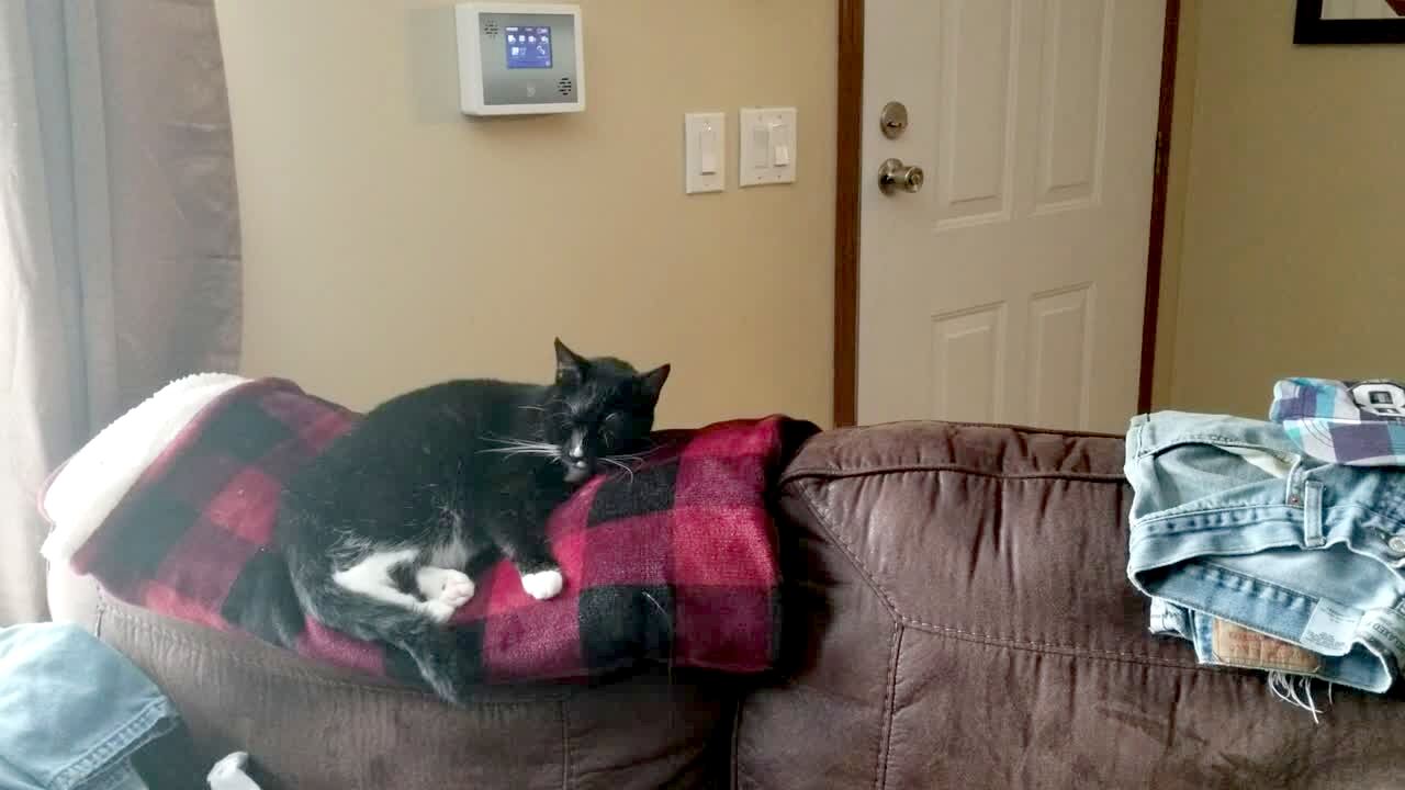 A teen boy encourages his cat to unlock a kitchen window while he is locked out of the house, and the cat uses his paws to let him into the house.