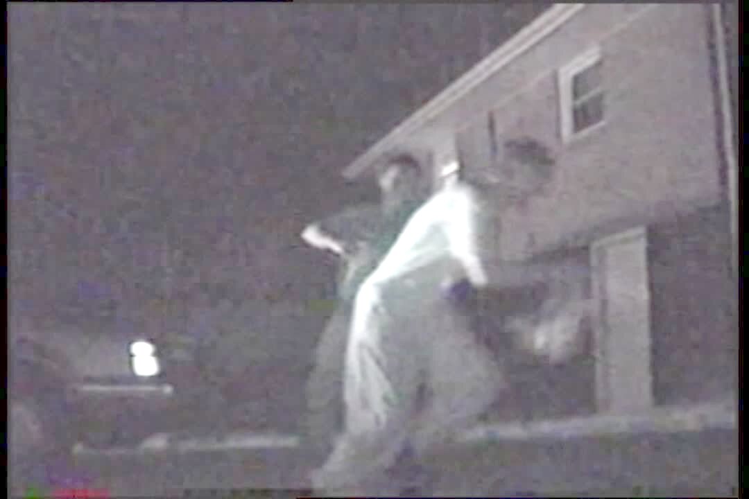 A young boy hides in a ghillie suit and scares a woman and another young boy that walk up to the house.