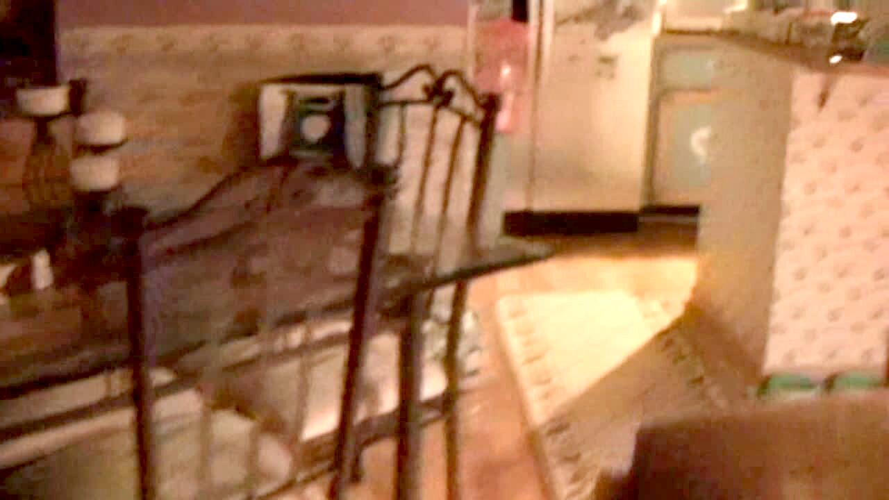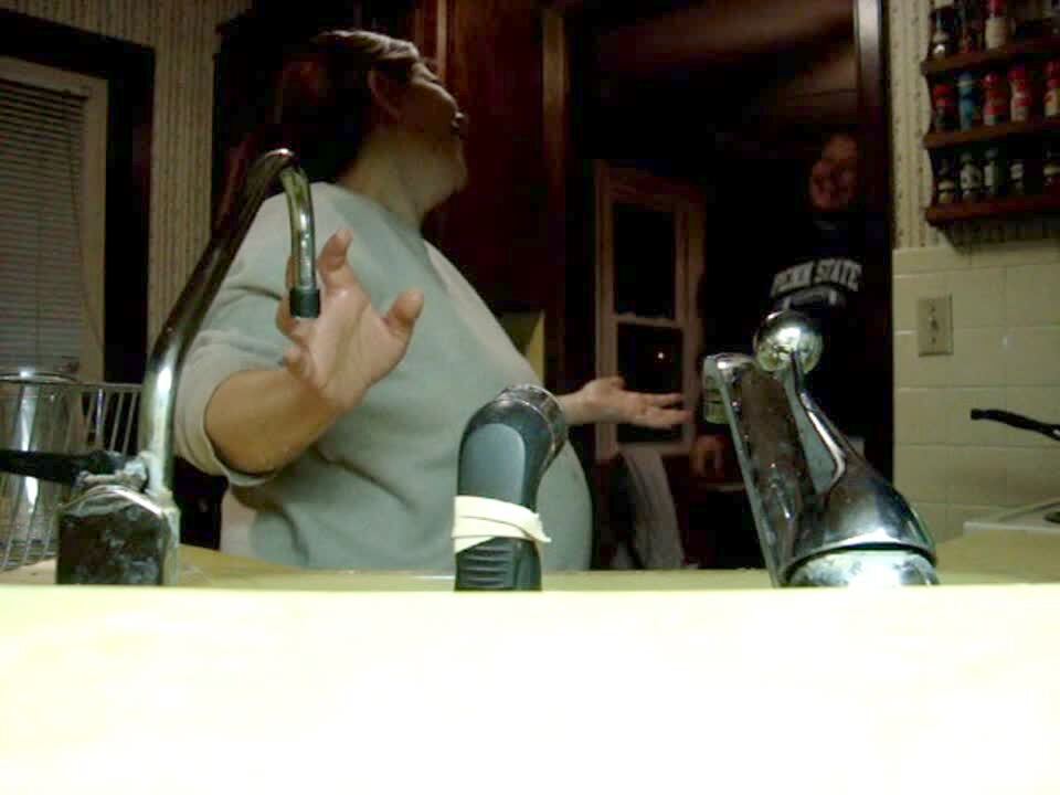 A man screams in the bathroom shower when a camerawoman sneaks in to scare him.