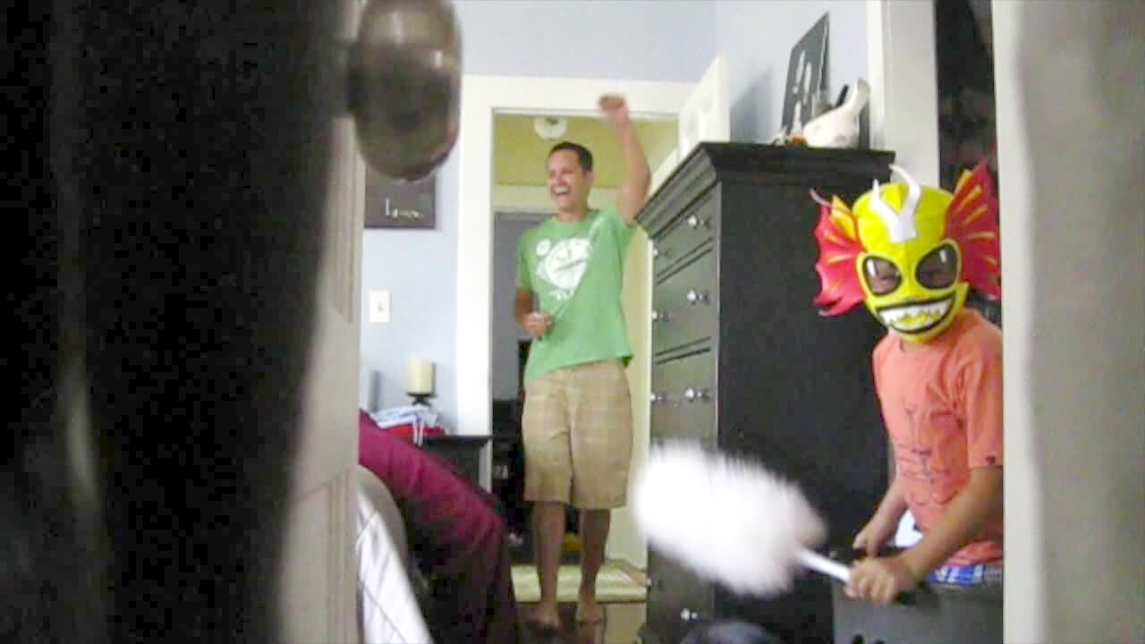A man sets up a camera, brings in his wife, and their son jumps out at her with a fish mask and a duster and she jumps and screams.