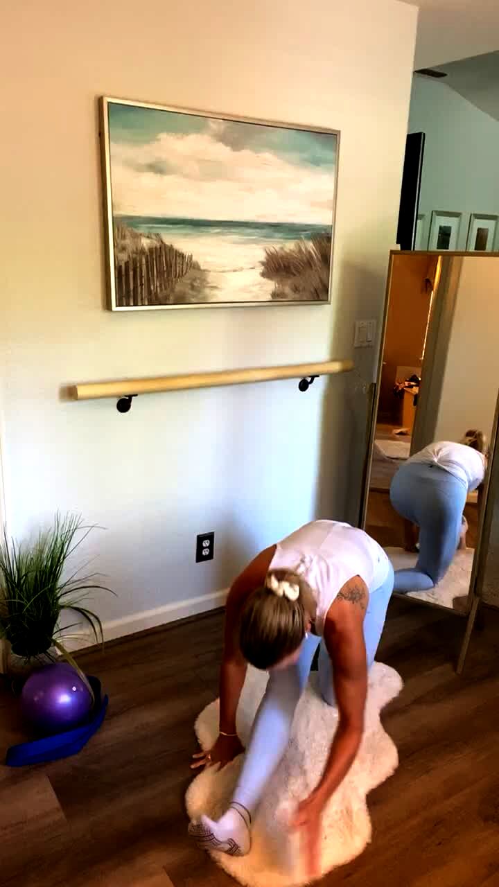 A woman stands on her husband's back while he lies down in a living room, then he gets up onto his hands and knees for a viral challenge, and she falls on his head as music plays. Music rights not cleared.