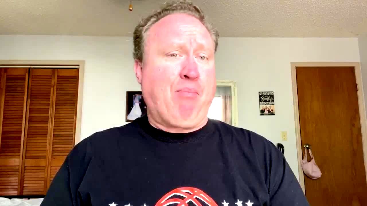 A man films a video for his students, then stops and says he wife's bra is hanging from a door knob behind him.
