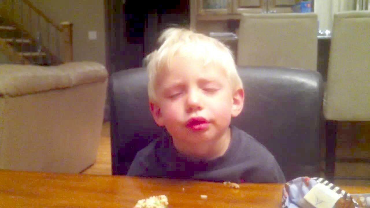 A black Lab dog sits indoors and drools as a woman puts bacon snacks on its nose and face. When the woman gives the command, the dog moves its head and the treats fall off-camera.
