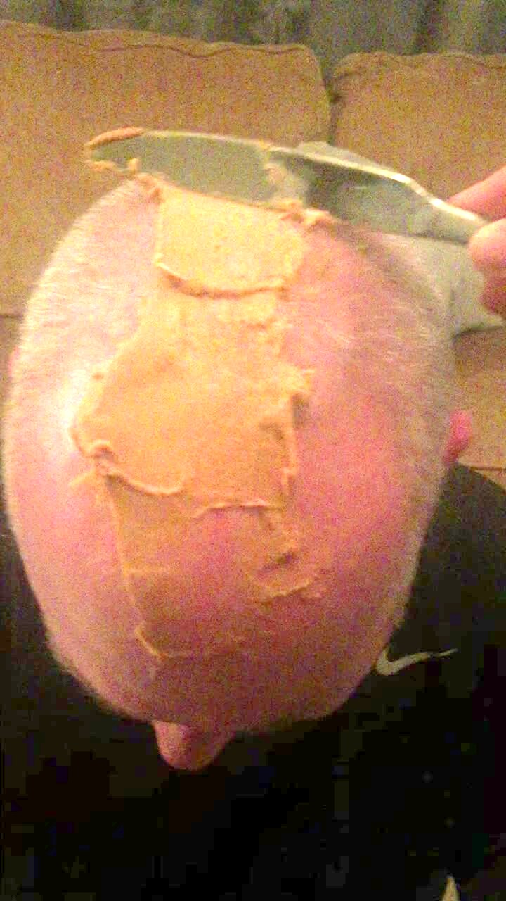 A woman spreads peanut butter on her husband's bald head, and their husky licks it off while the man trims its nails in the living room.