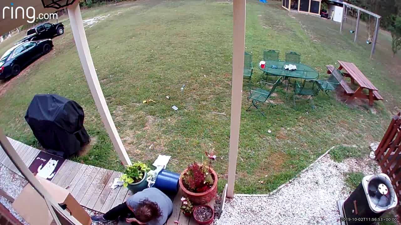 A man at a front door goes wave to someone at night and loses his balance and falls over a railing. A woman tries to grab his legs but she slips and he flips over the railing.