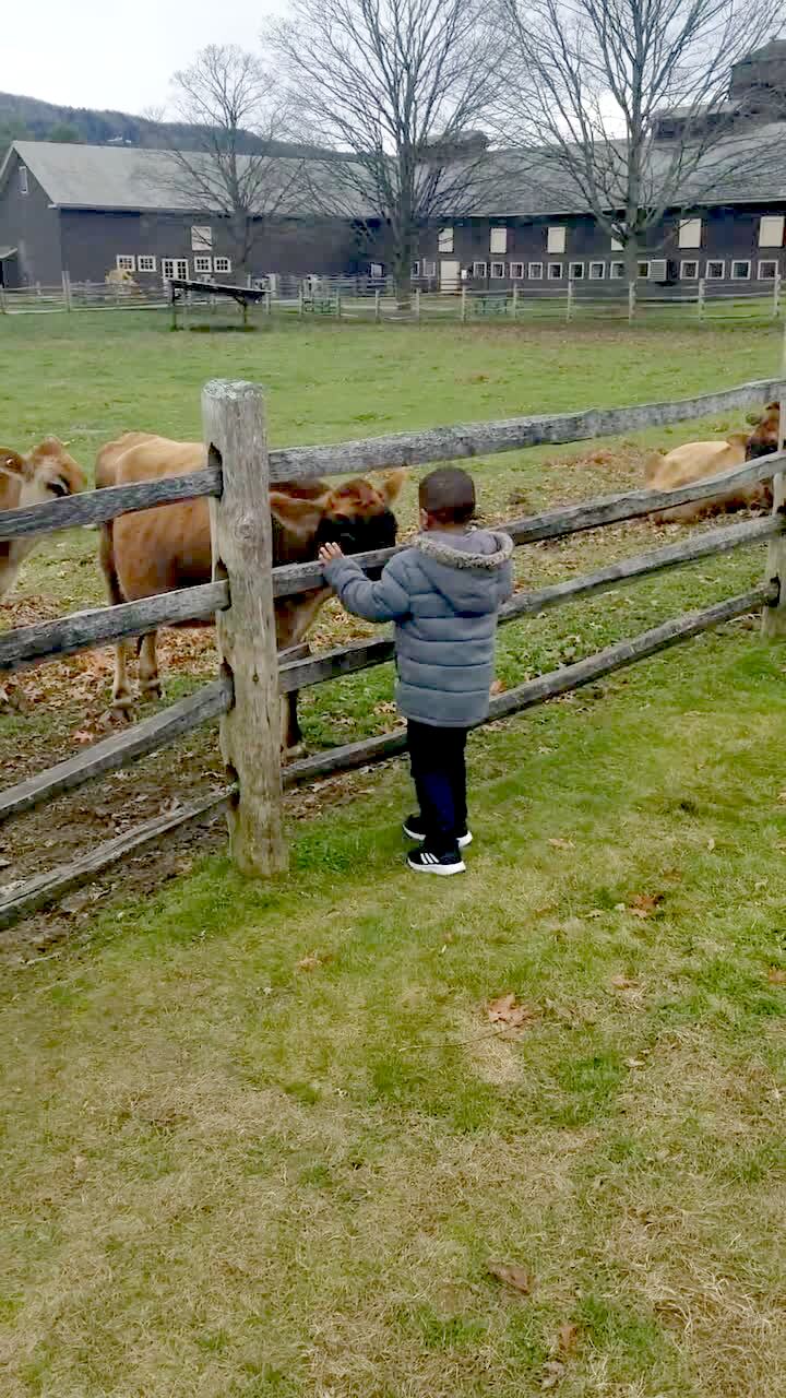 A cow sticks its head through a fence and knocks a young boy down to the ground on a farm.